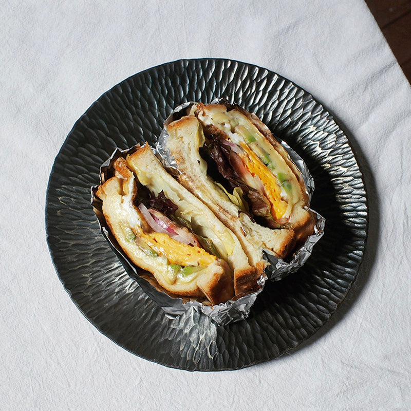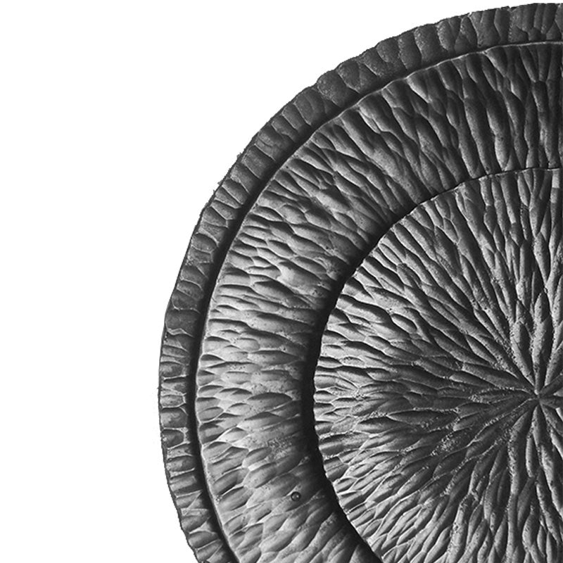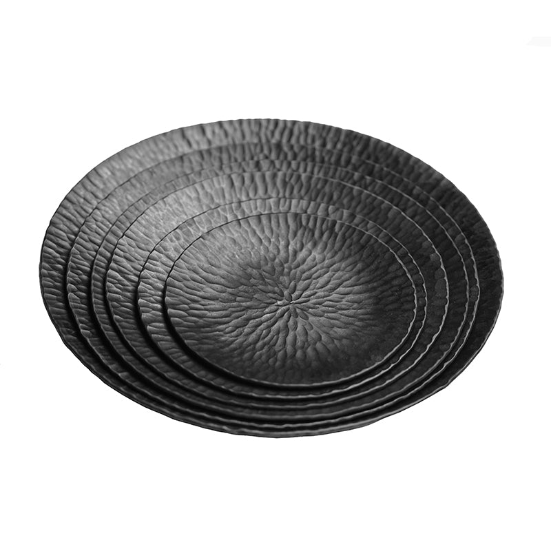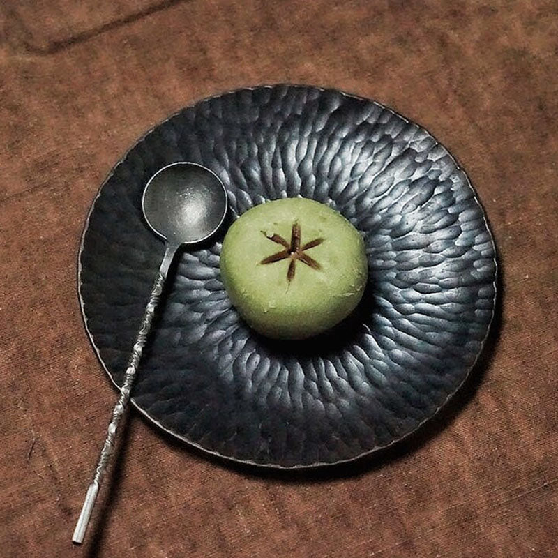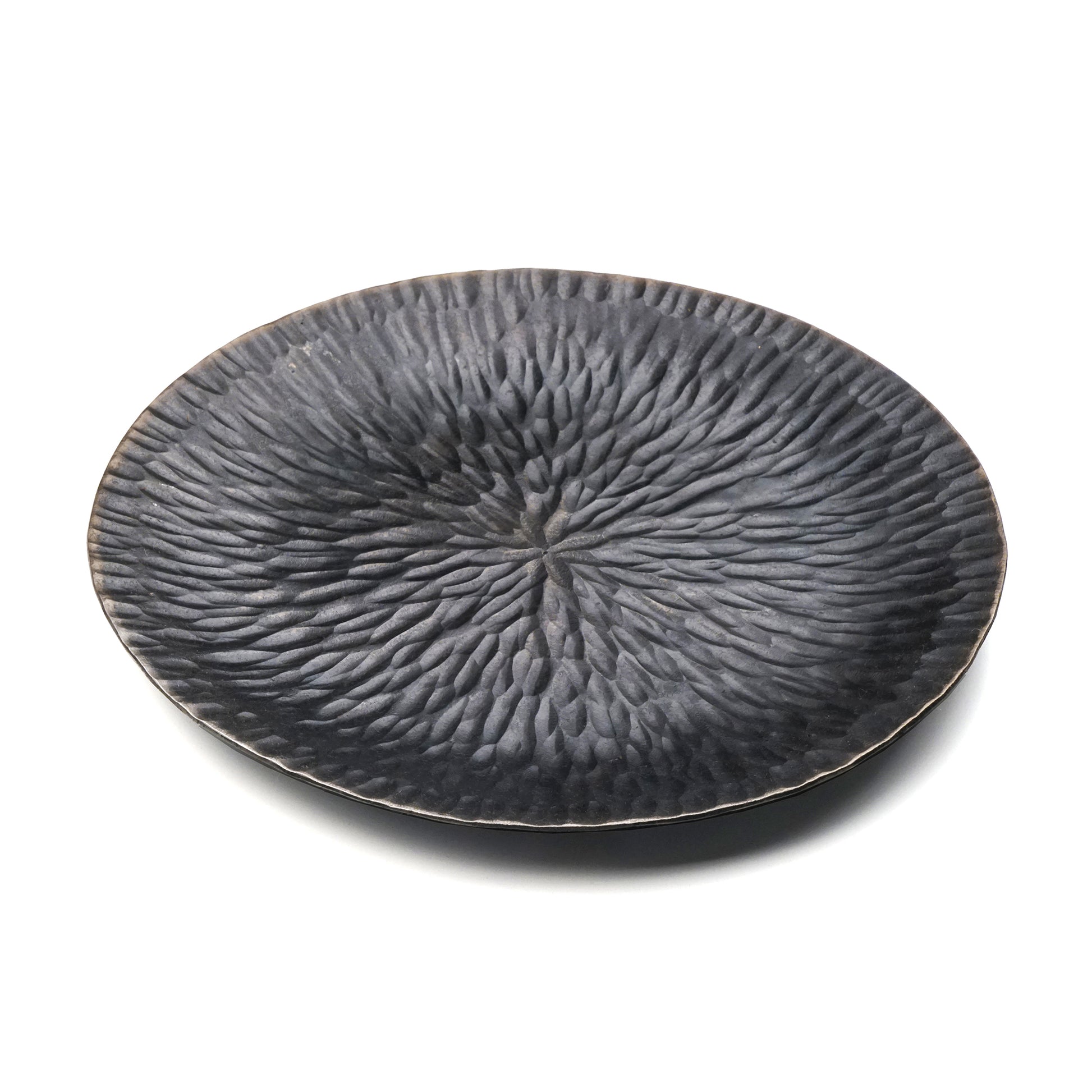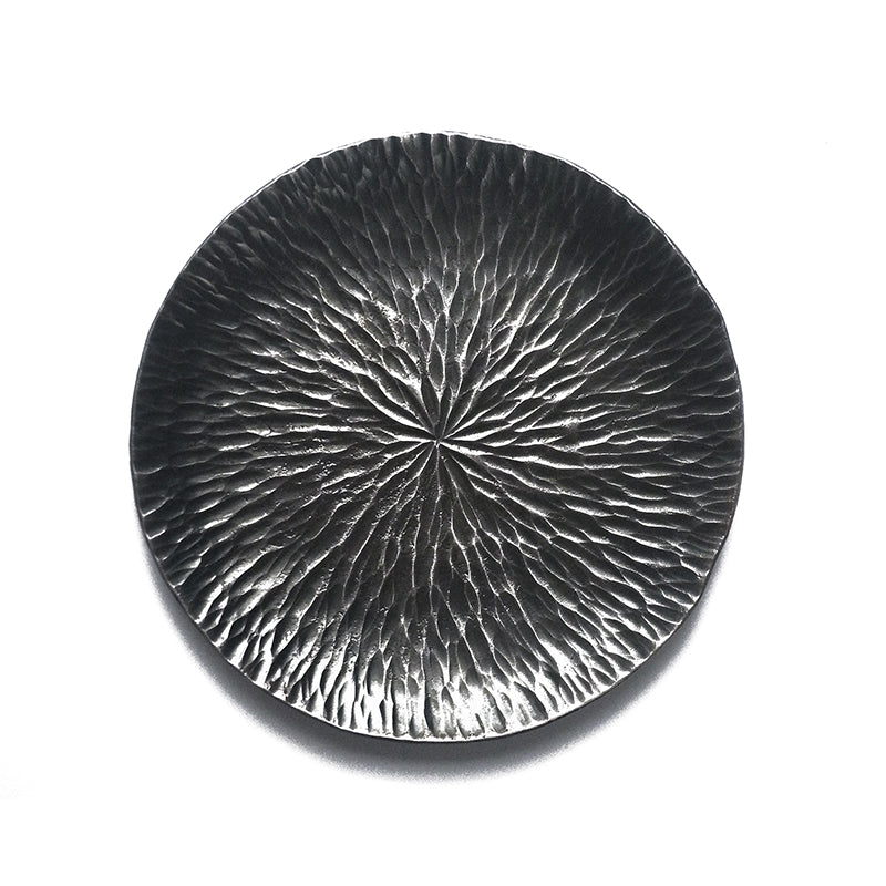 This hand-forged round iron plate adopts traditional metal forging technology. The craftsman repeatedly hits the iron with different hammers to form a natural and flexible hammer texture. Every concave and convex mark records the temperature of the hand-made, and there is no repetitive feeling of mechanical mass production. It can be used as a bread plate, snack tray, sushi plate, and can also be used for key storage, jewelry display, etc.