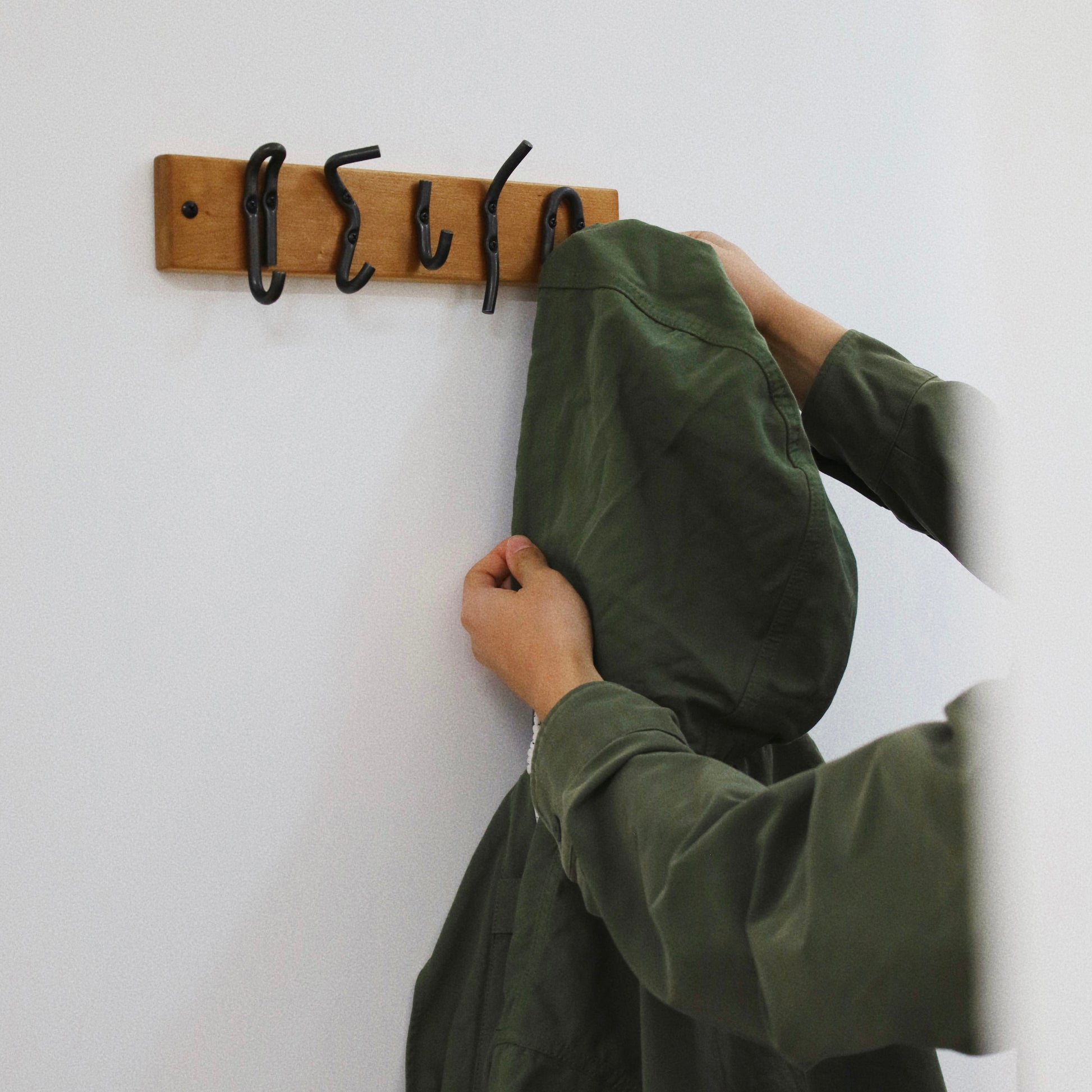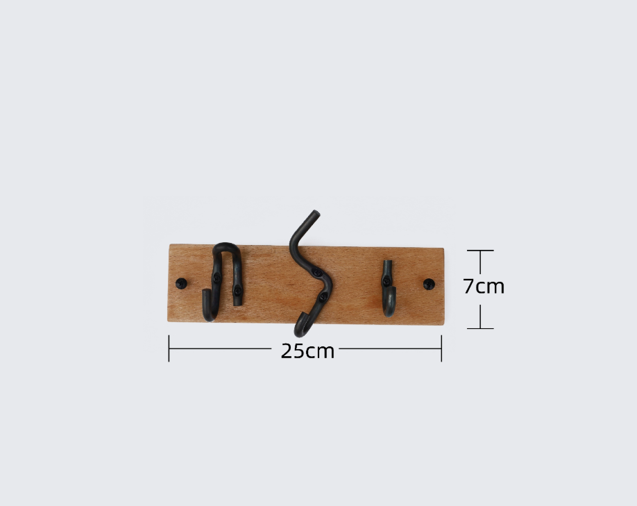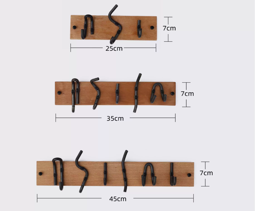 Wall-mounted coat rack/hook row, wooden base with black metal hooks, hooks of various shapes, simple and modern design, both practical and decorative. Can be used to hang coats, hats, scarves, keys and other items, suitable for entryways, bedrooms, bathrooms and other spaces.