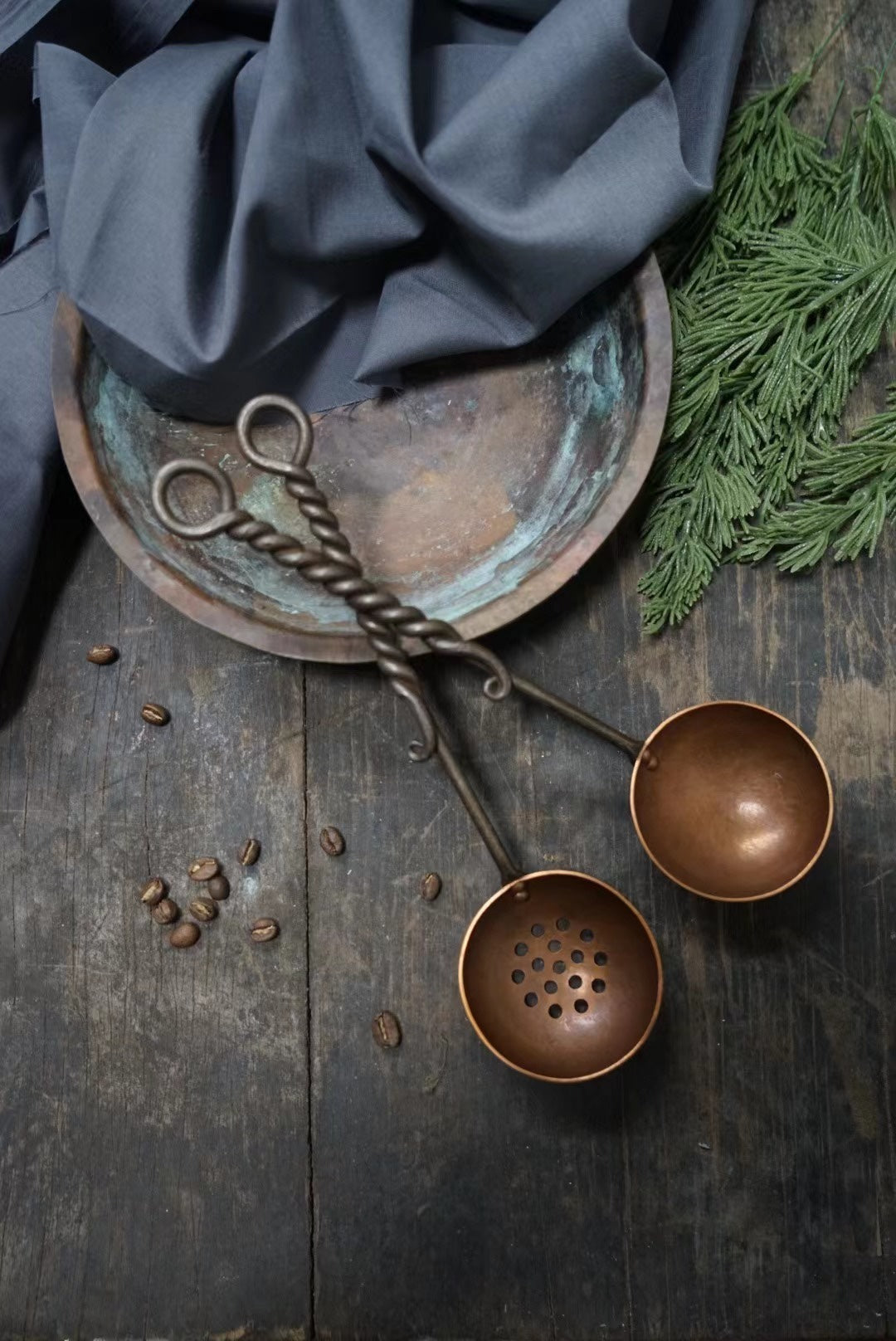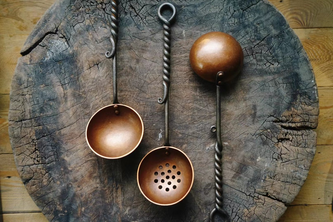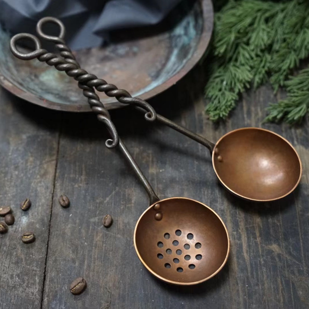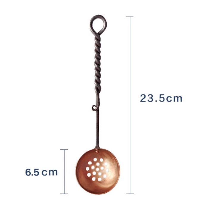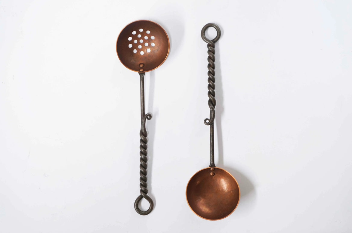 Solid spoons and strainers are made of copper bowls and forged iron handles, which have a twisted or curled design that shows their hand-forged characteristics.